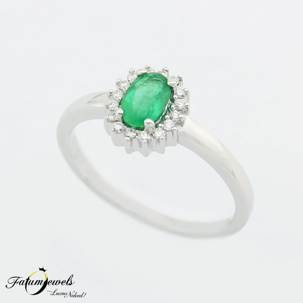 Nem kell feltétlenül a teljes gyűrűt színessé tenni, elég egy apró hangsúly. Helyezhetünk központi szerepbe például egy smaragd követ, amelyet apró gyémántokkal övezünk.